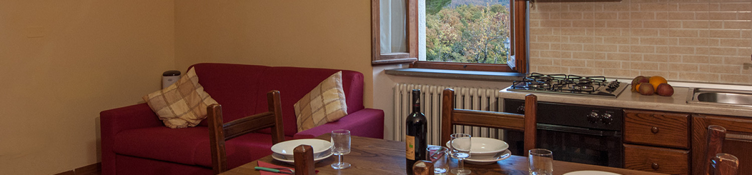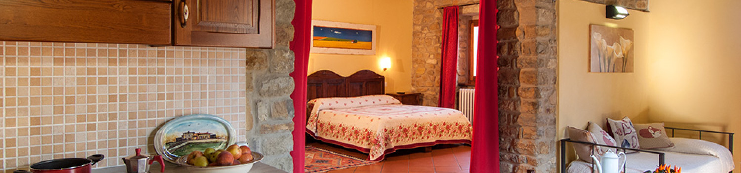 Das über 40 m² große Apartment liegt im Erdgeschoss direkt gegenüber dem Swimmingpool und bietet einen herrlichen Panoramablick bis zum Schloss von Poppi und über das schöne Casentino-Tal. Vor der Wohnung und im Schatten der weiß blühenden Akazien liegt ihr privater Außensitzplatz, der ihnen durch eine duftende Jasminhecke Privatsphäre bietet.